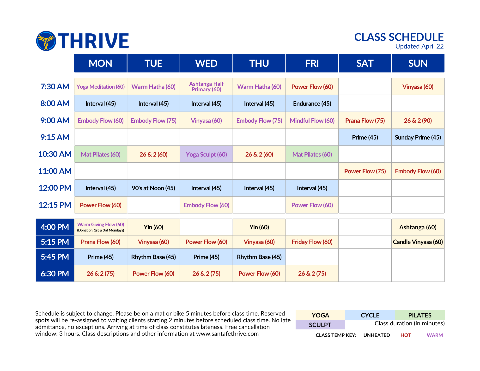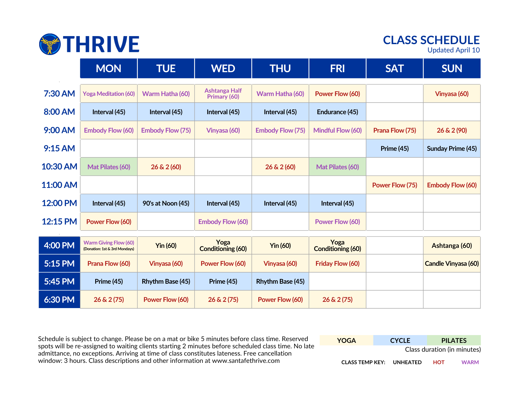 Arrive at least 5 minutes early — late arrivals cannot be accommodated, including arriving at time of class.