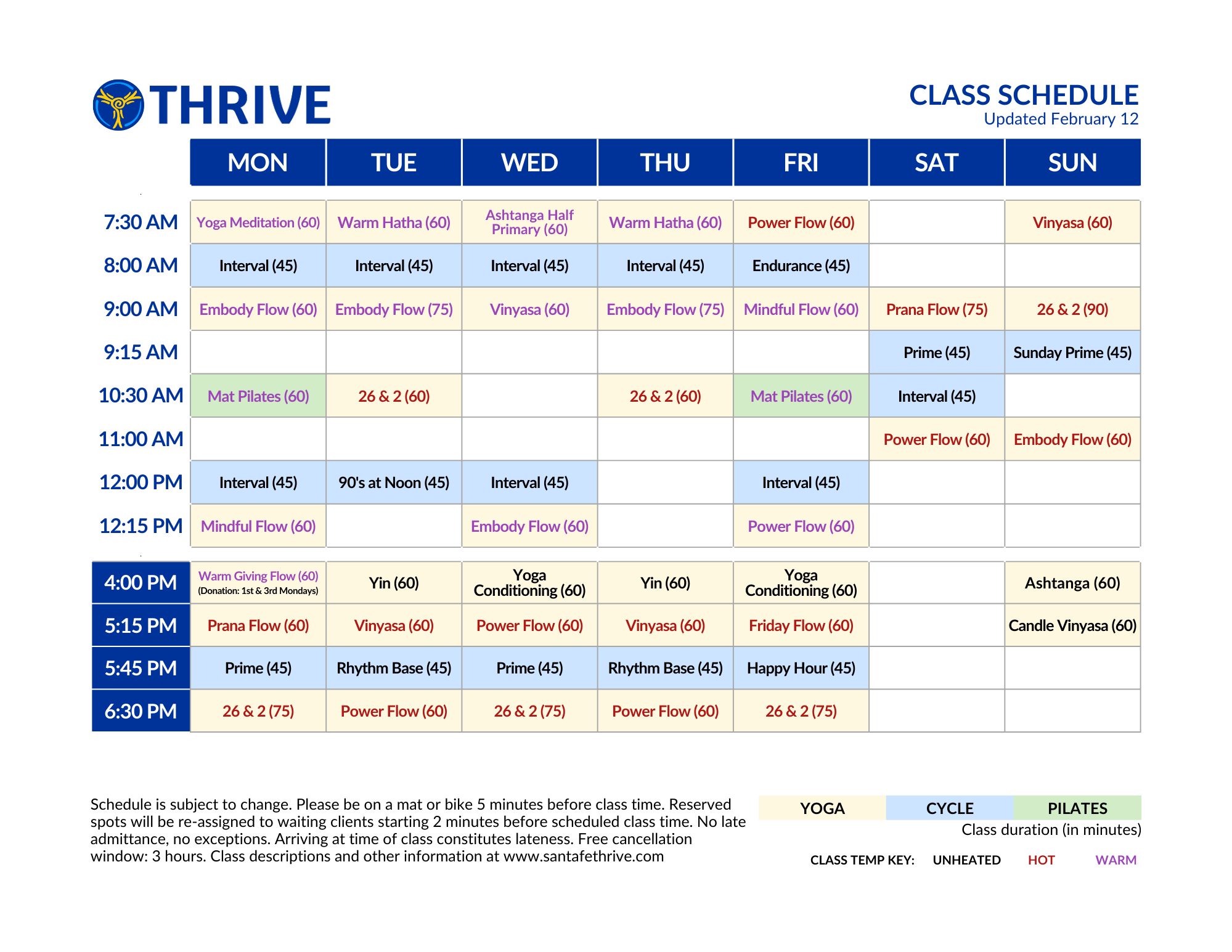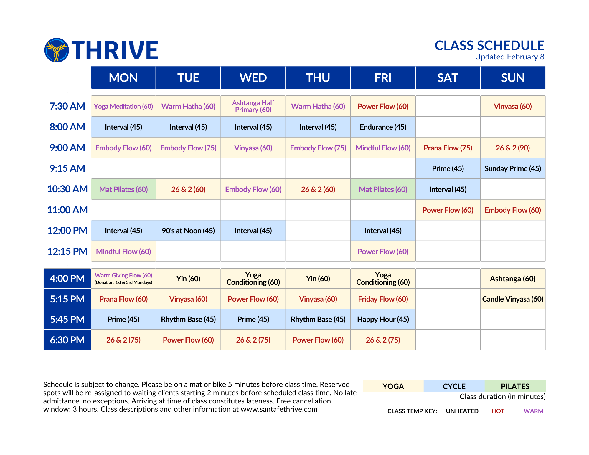 Thrive offers heated and unheated yoga, indoor cycling, mat Pilates, and fitness classes in a clean, welcoming space. We are a local, in-person studio focused on intelligent movement, genuine connection, and a supportive experience for every body. Enjoy private showers, free towel service, and passes that don’t expire.