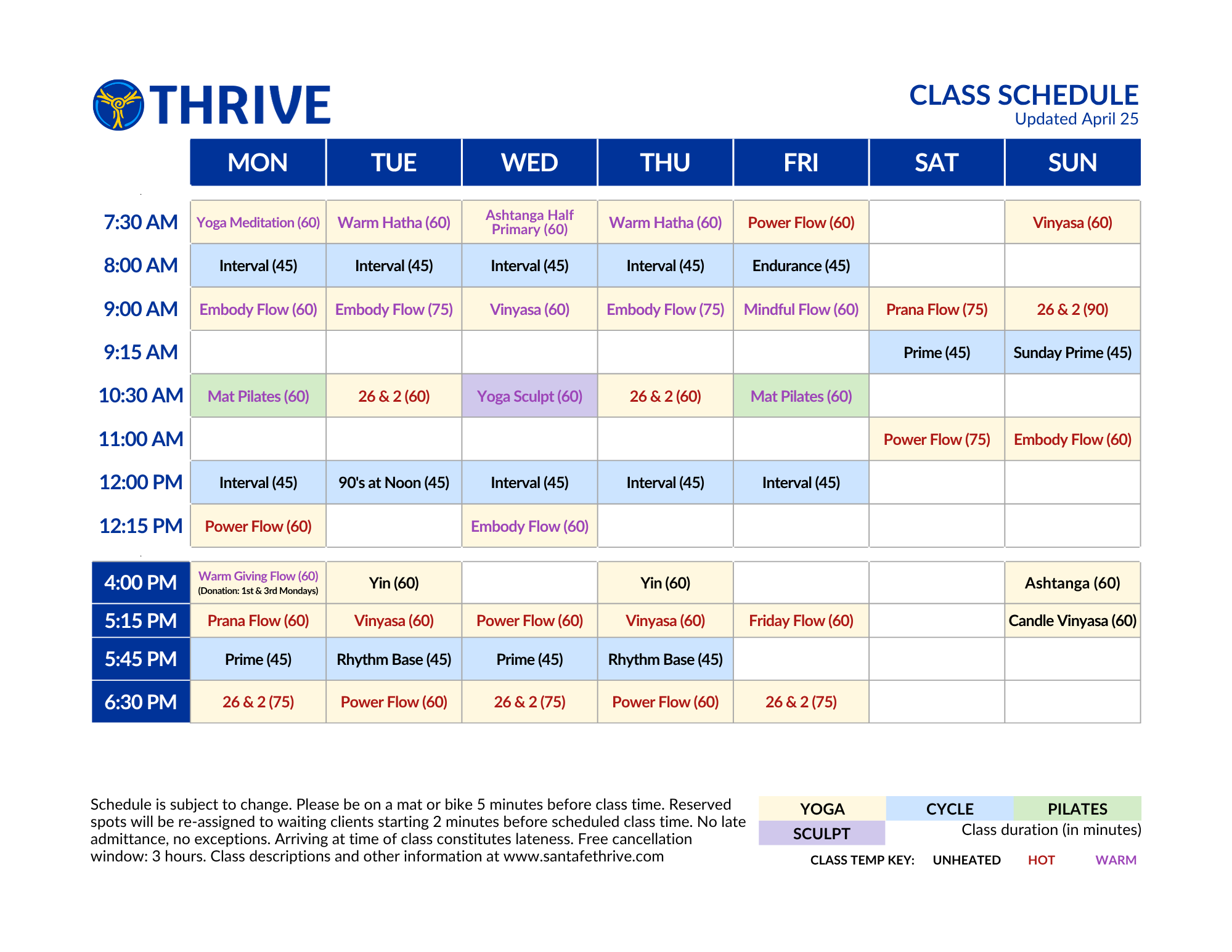 Thrive offers heated and unheated yoga, indoor cycling, mat Pilates, and fitness classes in a clean, welcoming space. Our local studio focuses on intelligent movement and genuine connection for every body. Enjoy private showers, free towel service, and a supportive environment.